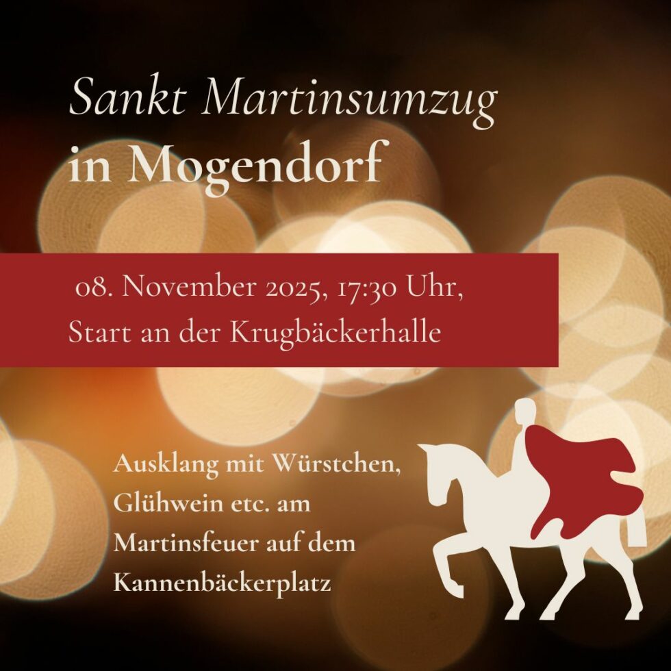 St. Martinsumzug in Mogendorf Am Samstag, den 8. November 2025, lädt die Ortsgemeinde Mogendorf herzlich zum diesjährigen St. Martinsumzug ein. Die Zugaufstellung beginnt um 17:30 Uhr an der Krugbäckerhalle. Von