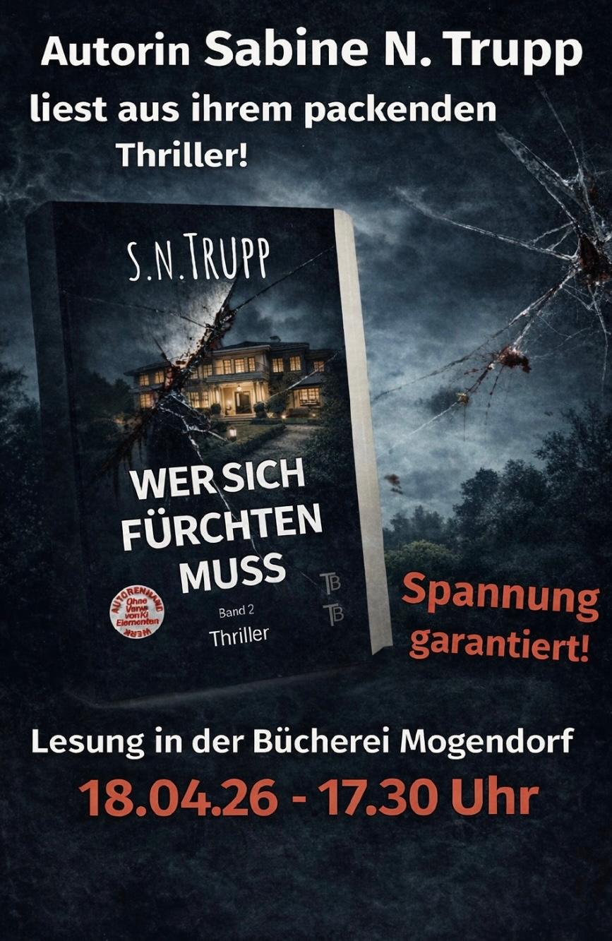 Die Gemeindebücherei Mogendorf lädt am Samstag, 18. April 2026, zu einer Autorenlesung mit der Thrillerautorin S. N. Trupp ein. Beginn der Veranstaltung ist um 17:30 Uhr in der Gemeindebücherei in