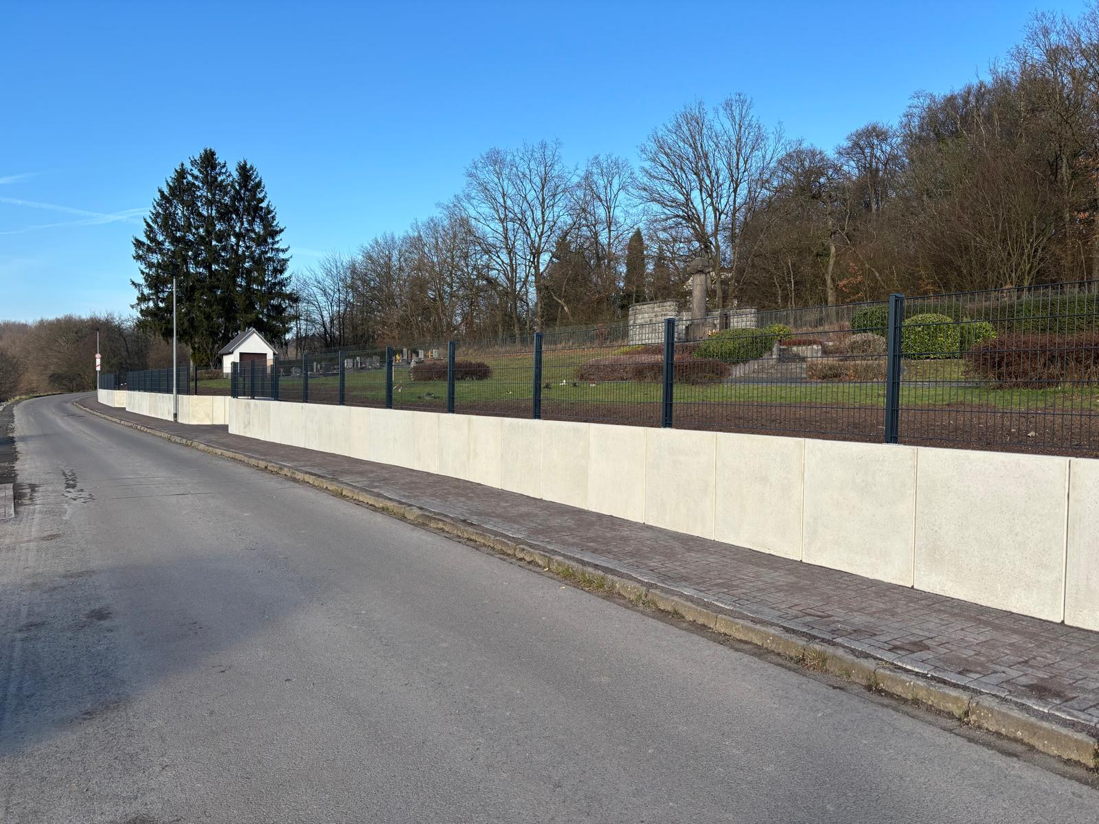 In den vergangenen Wochen wurden die erforderlichen Arbeiten zur Herstellung des neuen Fußweges am Friedhof erfolgreich durchgeführt. Zum Ausgleich des Höhenunterschiedes zum Friedhofsgelände wurde zunächst eine Stützmauer aus L-Steinen errichtet. Auf dieser wurde anschließend ein Zaun aus Doppelstahlmatten montiert. Der bisher zur Einfriedung genutzte Bauzaun, der dort viele Jahre stand, konnte nun endlich entfernt werden.
