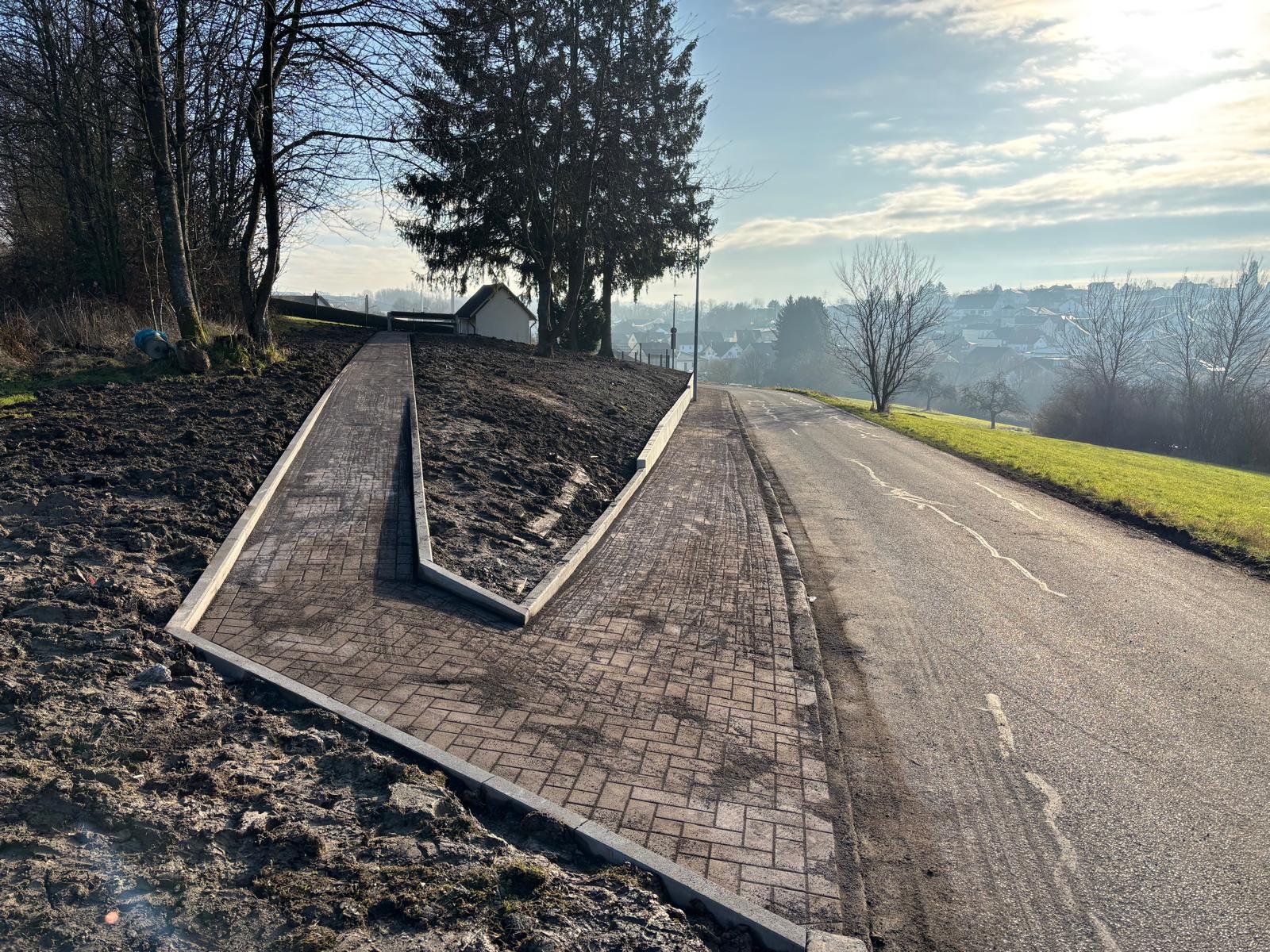 Im neuen Jahr stehen weitere Arbeiten am Außengelände der Trauerhalle auf dem Friedhofsgelände an. In diesem Zuge soll auch der Aufgang von der Straße bis zur Trauerhalle neu gepflastert werden, sodass künftig eine durchgängige Pflasterfläche bis zum neuen Gehweg entsteht.